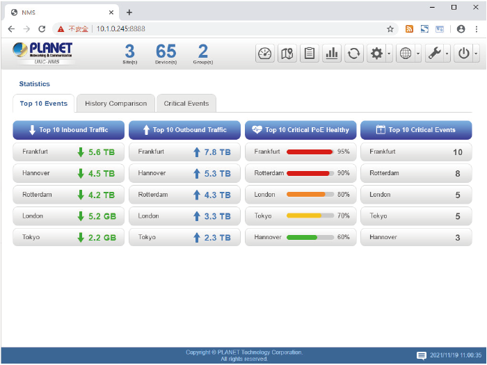 La página de estadísticas NMS enumera los 10 principales eventos de tráfico entrante y saliente, el estado de PoE y los eventos críticos. Puede ayudar al administrador a analizar qué dispositivo tiene un consumo de energía anormal, una temperatura anormalmente alta, un tiempo de uso ilegal y el final cercano del ciclo de vida para evitar un colapso de la red.