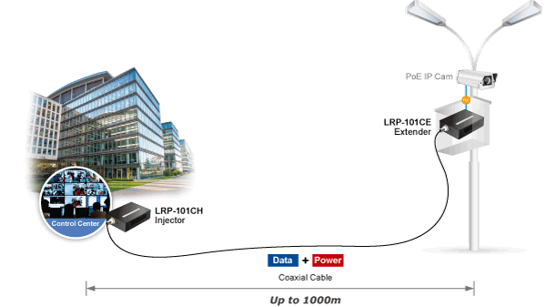 Un cable UTP normal solo se puede extender hasta 100 metros, pero el LRP-101CE, al trabajar con el inyector LRP o el conmutador LRP, puede extender la red PoE hasta 1000 metros (3280 pies) a través de un cable coaxial de 75 ohmios con transmisión de video estable y de alta calidad. Elimina la necesidad de una toma de corriente adicional, ya que su única fuente de alimentación puede proporcionar energía a un dispositivo alimentado por PoE a gran distancia a través del LRP-101CE.