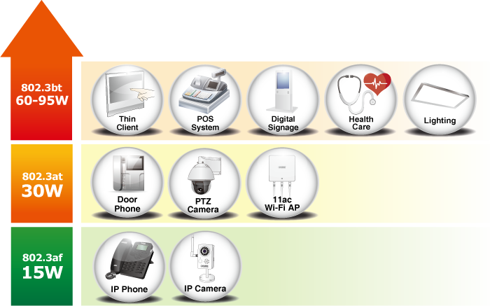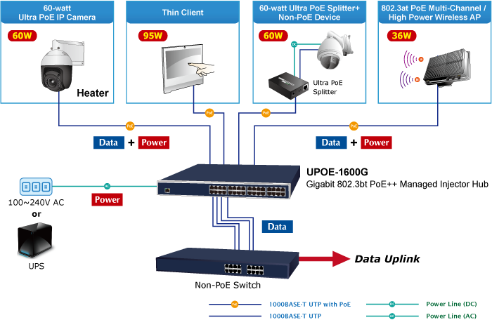 Como el UPOE-1600G adopta el estándar IEEE 802.bt PoE++ y la tecnología PoH, es capaz de generar hasta 95 vatios de energía utilizando los cuatro pares de cableado Ethernet Cat5e/6 estándar para suministrar energía y datos a máxima velocidad a cada dispositivo alimentado (PD) compatible con PoE remoto. Posee el triple de capacidad de potencia que el PoE+ 802.3at convencional y es una solución ideal para satisfacer la creciente demanda de dispositivos de red que consumen más energía, como: