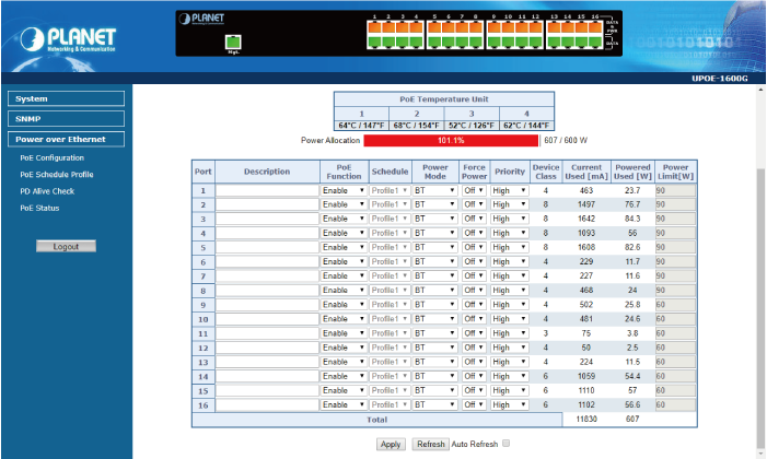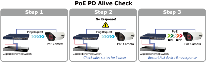 Los productos PoE administrados de PLANET adoptan no solo la tecnología Power over Ethernet, sino también el monitoreo automatizado de PD y el estado de PoE en tiempo real. El UPOE-1600G se puede configurar para supervisar el estado del PD conectado en tiempo real mediante una acción de ping a través del conmutador Ethernet de enlace ascendente. Una vez que el PD deja de funcionar y responder, el UPOE-1600G reciclará la energía del puerto PoE y hará que el PD vuelva a funcionar. También mejorará en gran medida la confiabilidad de la red, ya que el puerto PoE restablecerá la energía del PD, lo que reducirá la carga de administración del administrador.