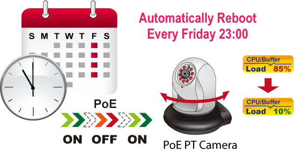 El UPOE-1600G permite que cada una de las cámaras IP PoE o puntos de acceso inalámbricos PoE conectados se reinicie a una hora específica cada semana. Por lo tanto, reducirá la posibilidad de que la cámara IP o el punto de acceso se bloqueen como resultado del desbordamiento del búfer.