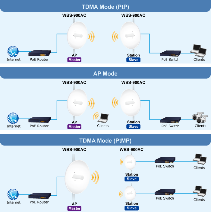 El WBS-900AC está especialmente diseñado para soluciones inalámbricas para exteriores de larga distancia que son capaces de establecer una conexión de puente estable con una antena parabólica de alta ganancia de 25 dBi. Para proporcionar un largo alcance y un rendimiento máximo, el WBS-900AC puede implementar 3 modos de operación y es fácil de usar donde se pueden realizar una multitud de aplicaciones en comunidades, almacenes, campus, puertos, etc.