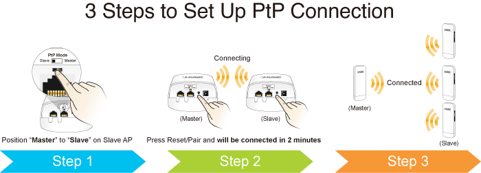 Sin necesidad de entrar en la interfaz web para la configuración, el WBS-512AC tiene el interruptor DIP para configurarlo como maestro (modo AP) y como esclavo (modo repetidor). El usuario solo necesita tres sencillos pasos para establecer la conexión PtP sin ninguna dificultad. Con solo cambiar el botón a “Maestro” en el AP maestro y presionar el botón de reinicio, la conexión PtP se puede establecer en 2 minutos, como se muestra a continuación.