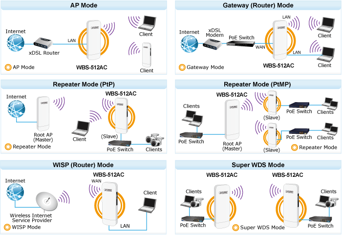 El WBS-512AC está especialmente diseñado para vigilancia al aire libre de larga distancia y soluciones de backhaul inalámbrico que son capaces de establecer una conexión de puente estable a través de la antena unidireccional de 14 dBi incorporada. Para proporcionar el máximo rendimiento, el WBS-512AC puede implementar hasta 6 modos de funcionamiento y es fácil de usar, ya que se pueden realizar multitud de aplicaciones en comunidades, almacenes, campus, puertos, etc.
