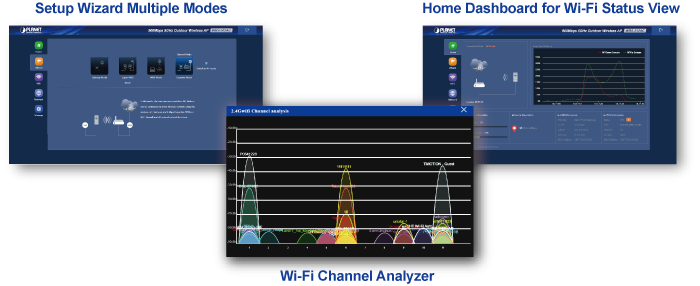 El nuevo asistente de configuración de GUI ayuda al administrador del sistema a configurar fácilmente el WBS-512AC paso a paso. Además, el analizador de Wi-Fi integrado proporciona la utilización del canal en tiempo real para evitar la superposición de canales y garantizar un mayor rendimiento. Gracias al mecanismo de transmisión de potencia automático, el control de distancia y la programación de reinicio, el administrador puede implementar y administrar fácilmente el WBS-512AC sin necesidad de mantenimiento en el sitio. Además, puede utilizar la función de control de AP PLANET NMS-500 o NMS-1000V para enviar perfiles inalámbricos a varios AP simultáneamente, lo que simplifica la administración central.