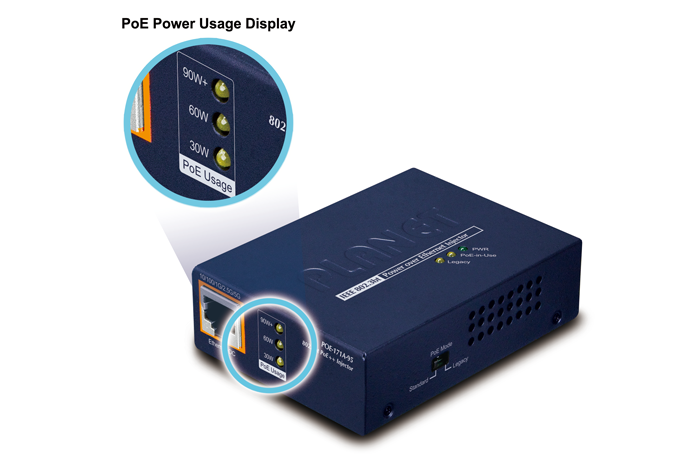 PLANET POE-171A-95 es un inyector de alimentación a través de Ethernet 802.3bt de un solo puerto con un máximo de 95 vatios de potencia de salida a través de cables Ethernet. También está equipado con dos interfaces de cobre RJ45 de 10 M/100 M/1 G/2,5 G/5 GBASE-T para gestionar cantidades extremadamente grandes de transmisión de datos.