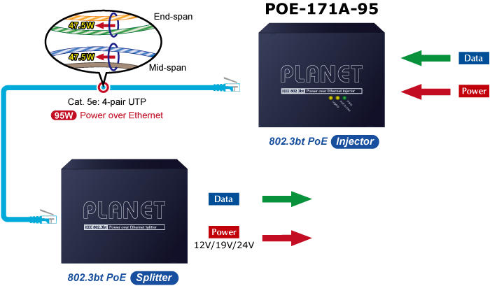 En lugar de suministrar energía a través de UTP trenzado de 2 pares, ya sea en el extremo (pines 1, 2, 3 y 6) o en el medio (pines 4, 5, 7 y 8), el POE-171A-95 brinda la capacidad de suministrar hasta 95 vatios de energía mediante el uso de los cuatro pares de cableado Ethernet estándar Cat. 5e/Cat. 6.