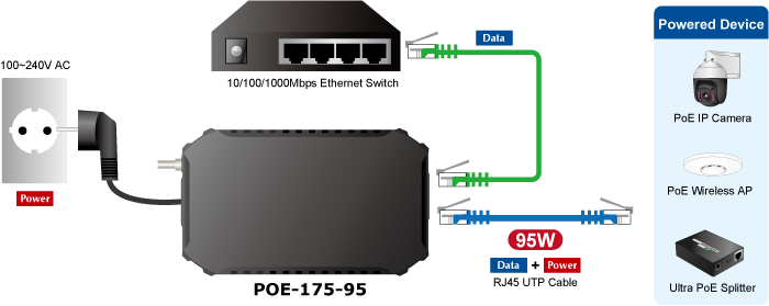 El POE-175-95 entrega los datos digitales Ethernet con una potencia de 54 V CC a través de cables de par trenzado como un inyector de alimentación a través de Ethernet de 95 vatios, y el divisor de alimentación a través de Ethernet ultra conectado, el POE-173S, separará los datos digitales y la potencia en tres salidas opcionales (12 V/19 V/24 V CC) con una distancia de hasta 100 metros.