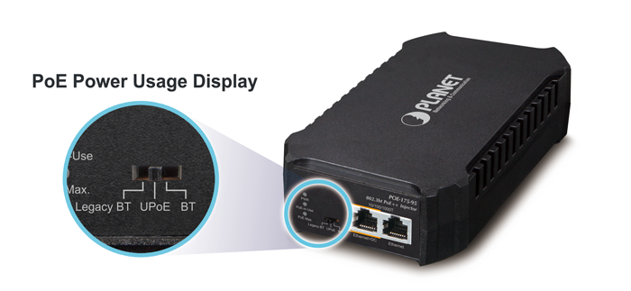 PLANET POE-175-95 es un inyector de alimentación a través de Ethernet 802.3bt de 1 puerto con un máximo de 95 vatios de potencia de salida a través de cables Ethernet.