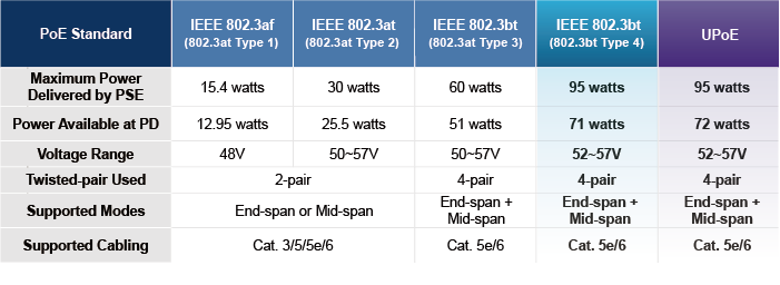 En lugar de suministrar energía a través de UTP trenzado de 2 pares, ya sea en el extremo (pines 1, 2, 3 y 6) o en el medio (pines 4, 5, 7 y 8), proporciona la capacidad de generar hasta 95 vatios de energía mediante el uso de los cuatro pares de cableado Ethernet estándar Cat.5e/Cat. 6.