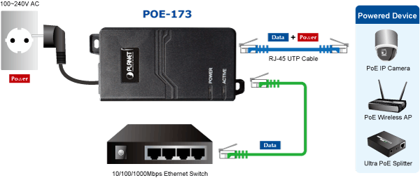 El inyector Ultra Power over Ethernet PLANET POE-173 proporciona una potencia máxima de hasta 60 vatios y una conexión de datos Ethernet de alta velocidad en cualquier lugar de su infraestructura de red. La solución Ultra Power over Ethernet PLANET contiene dos productos completamente nuevos: