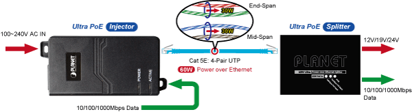 La solución Ultra PoE POE-173 y POE-171S utiliza el mismo estándar de cableado que IEEE 802.3at/af PoE. En lugar de suministrar energía a través de un cable UTP trenzado de dos pares (ya sea en el extremo del cable (pines 1, 2, 3 y 6) o en el medio del cable (pines 4, 5, 7 y 8), ofrece la capacidad de generar hasta 60 vatios de energía utilizando los cuatro pares de cableado Ethernet estándar Cat5e/Cat6. En el nuevo sistema de cuatro pares, se utilizarán dos controladores PSE para alimentar tanto los pares de datos como los pares de repuesto.