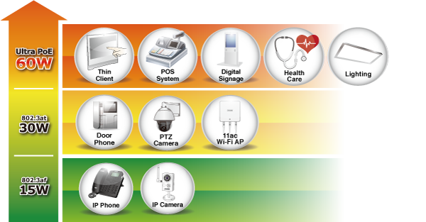 Las soluciones Ultra PoE POE-172 y POE-171S utilizan el mismo estándar de cableado, como IEEE 802.3at/af PoE. En lugar de suministrar energía a través de dos pares de UTP trenzado (ya sea en el extremo del cable (pines 1, 2, 3 y 6) o en el medio del cable (pines 4, 5, 7 y 8), ofrece la capacidad de generar hasta 60 vatios de energía utilizando los cuatro pares de cableado Ethernet Cat. 5e/Cat. 6 estándar. En el nuevo sistema de cuatro pares, se utilizarán dos controladores PSE para alimentar tanto los pares de datos como los pares de repuesto.