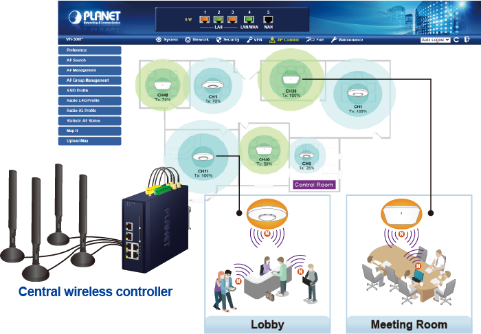 El ICG-2515W-NR proporciona una gestión centralizada de la serie PLANET Smart AP a través de una interfaz gráfica de usuario web fácil de usar. Es fácil configurar el punto de acceso para la SSID inalámbrica, la banda de radio y las configuraciones de seguridad. Con un proceso de configuración de cuatro pasos, los perfiles inalámbricos para diferentes propósitos se pueden entregar simultáneamente a varios puntos de acceso o grupos de puntos de acceso para minimizar el tiempo, el esfuerzo y el costo de implementación.