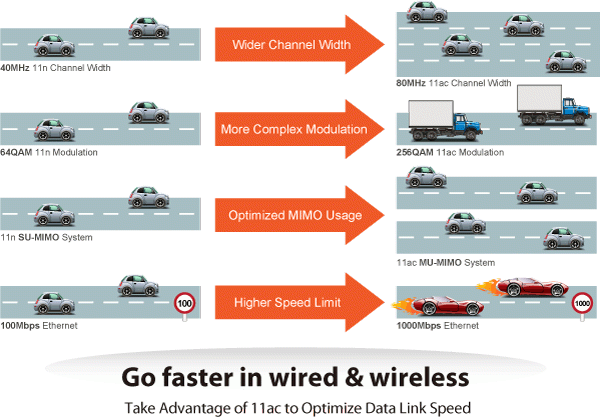 El VR-300W5 y el VR-300PW5 están diseñados con un amplificador de alta potencia y 4 antenas de alta sensibilidad que proporcionan una señal más fuerte y una cobertura excelente incluso en entornos de gran alcance o con malas condiciones climáticas. Con la opción de potencia de transmisión ajustable, el administrador puede reducir o aumentar de manera flexible la potencia de salida para diversos entornos, lo que reduce la interferencia para lograr el máximo rendimiento. Para proporcionar una experiencia de usuario de altísima velocidad, el VR-300W5 y el VR-300PW5 adoptan la tecnología IEEE 802.11ac para ampliar la vinculación del canal 802.11n de 40 MHz a 80 MHz y la implementación de la modulación 256-QAM donde las velocidades de transmisión/recepción más altas llegan hasta los 867 Mbps en la banda de frecuencia de 5 GHz con menos interferencias. Además, el VR-300W5 y el VR-300PW5 están equipados con un puerto LAN Gigabit para eliminar la restricción de la conexión por cable Fast Ethernet de 100 Mbps para permitir que los usuarios disfruten plenamente de la alta velocidad que ofrece la tecnología inalámbrica. El IEEE 802.11ac también optimiza el mecanismo MU-MIMO (Multi-User MIMO) para dar servicio a varios dispositivos simultáneamente.