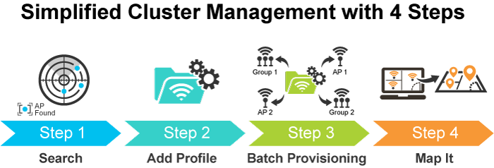 Por ejemplo, para configurar varios Smart AP del mismo modelo, el VR-300W5 y el VR-300PW5 permiten agruparlos en un grupo administrado para una gestión unificada. Según los requisitos, los AP inalámbricos se pueden ampliar o eliminar de un grupo de AP inalámbricos en cualquier momento. El clúster de AP se beneficia de la provisión masiva y la actualización masiva de firmware a través de un único punto de entrada en lugar de tener que configurar los ajustes en cada uno de ellos por separado.