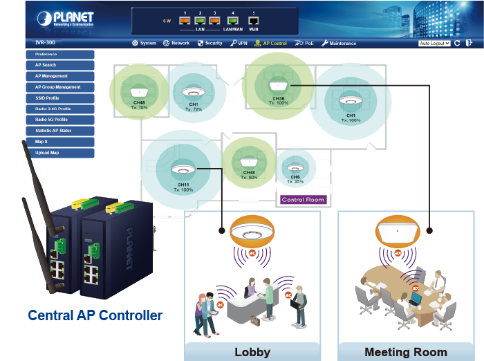 El IVR-300W ofrece una gestión centralizada de la serie PLANET Smart AP a través de una interfaz gráfica de usuario web fácil de usar. Es fácil configurar el punto de acceso para la SSID inalámbrica, la banda de radio y la configuración de seguridad. Con un proceso de configuración de cuatro pasos, se pueden enviar perfiles inalámbricos para diferentes propósitos simultáneamente a varios puntos de acceso o grupos de puntos de acceso para minimizar el tiempo, el esfuerzo y el costo de implementación.