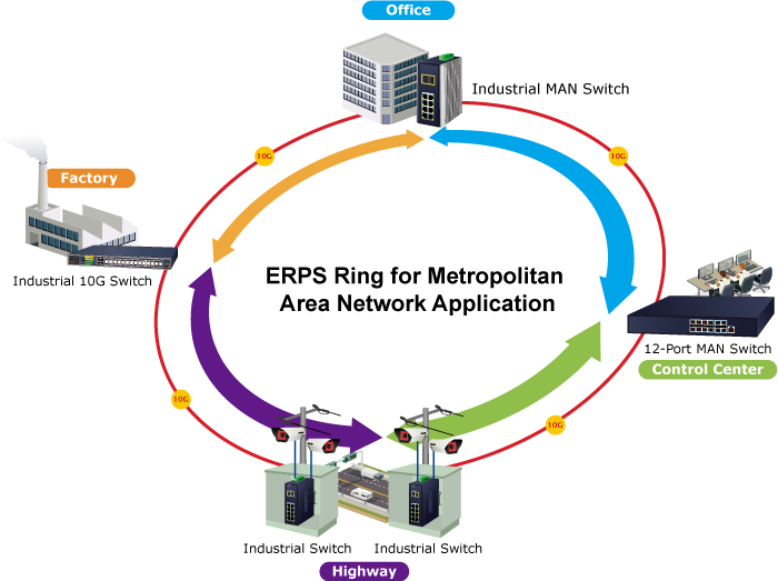 El XGS-6311-12X admite la tecnología de anillo redundante y cuenta con una capacidad de autorrecuperación rápida y sólida para evitar interrupciones e intrusiones externas. Incorpora la tecnología avanzada ITU-T G.8032 ERPS (Ethernet Ring Protection Switching) y el protocolo Spanning Tree (802.1s MSTP) en la red del cliente para mejorar la confiabilidad del sistema y el tiempo de funcionamiento en entornos hostiles. En una determinada red de anillo simple, el tiempo de recuperación podría ser inferior a 15 ms para que la red vuelva rápidamente a funcionar con normalidad.