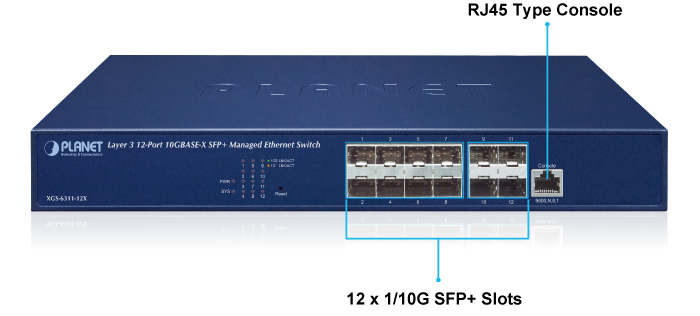 PLANET XGS-6311-12X es un switch Ethernet de 10 Gbps con todos los puertos y totalmente administrado, diseñado para la demanda de equipos de red que requieren un gran ancho de banda, como puntos de acceso inalámbricos Wi-Fi 6/6E, NAS y estaciones de trabajo. Cuenta con 12 puertos de fibra SFP+ 10GBASE-X que están diseñados de manera flexible para extender la distancia de conexión.