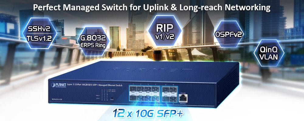 El XGS-6311-12X ofrece rendimiento de alta densidad, enrutamiento estático de capa 3, RIP (protocolo de información de enrutamiento) y OSPF (primero la ruta más corta abierta) con interfaces de 10 Gbps.