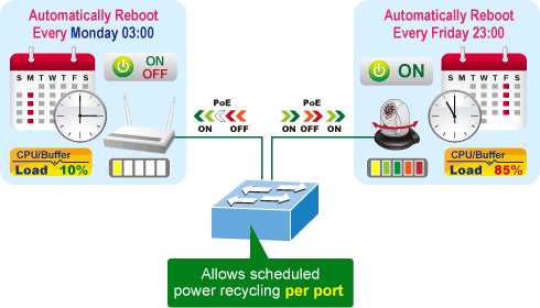 El LRP-1622CS permite que cada una de las cámaras IP PoE o puntos de acceso inalámbricos PoE conectados a través del extensor PoE de largo alcance LRP-101CE se reinicie en un momento específico cada semana. Por lo tanto, reducirá la posibilidad de que la cámara IP o el punto de acceso inalámbrico se bloqueen como resultado de un desbordamiento del búfer.