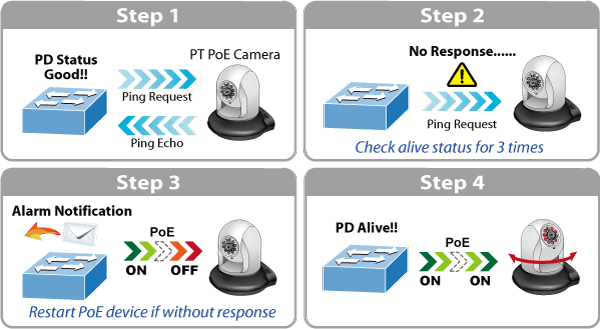 El LRP-1622CS se puede configurar para monitorear el estado del PD (dispositivo alimentado) conectado en tiempo real a través de la acción de ping. Una vez que el PD deja de funcionar y responder, el LRP-1622CS reanudará la alimentación del puerto PoE y hará que el PD vuelva a funcionar. Mejorará en gran medida la confiabilidad de la red a través del puerto PoE que restablece la fuente de alimentación del PD y reduce la carga de administración del administrador.
