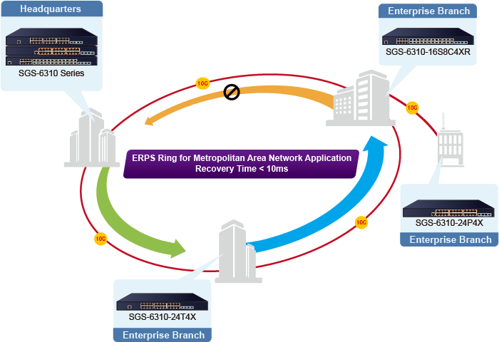 La serie SGS-6310 admite la tecnología de anillo redundante y cuenta con una capacidad de autorrecuperación rápida y sólida para evitar interrupciones e intrusiones externas. Incorpora la tecnología avanzada ITU-T G.8032 ERPS (Ethernet Ring Protection Switching) y el protocolo Spanning Tree (802.1s MSTP) en la red del cliente para mejorar la confiabilidad del sistema y el tiempo de funcionamiento en entornos hostiles. En una determinada red de anillo simple, el tiempo de recuperación podría ser inferior a 10 ms para que la red vuelva rápidamente a funcionar normalmente.