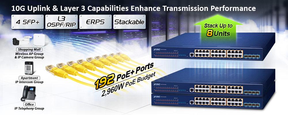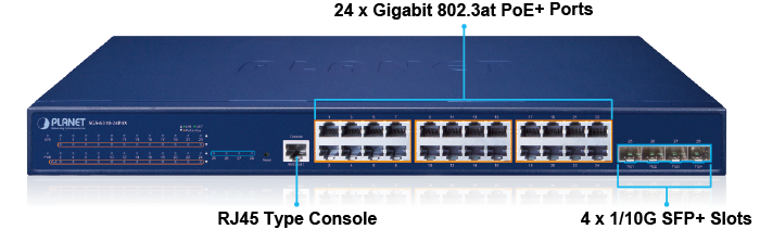 La serie SGS-6310 de PLANET es un nuevo conmutador Gigabit gestionable apilable de capa 3 con capacidad de enlace ascendente de 10 Gbps para varios tipos de aplicaciones de red y una implementación flexible. El SGS-6310-24P4X cuenta con 24 puertos 10/100/1000BASE-T RJ45 802.3at PoE+ con presupuesto PoE de hasta 370 vatios y 4 puertos 1G/10GBASE-X SFP+ con estructura de conmutación de 128 Gbps, todo ello en un resistente chasis de 1U.