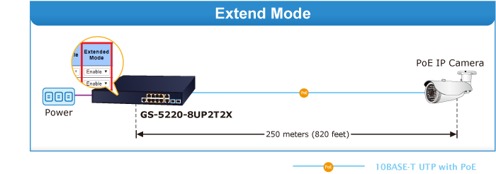En el modo de funcionamiento "Extendido", el GS-5220-8UP2T2X funciona por puerto a una velocidad dúplex de 10 Mbps, pero puede admitir una salida de alimentación PoE de 95 vatios a una distancia de hasta 250 metros, superando el límite de 100 m del cable UTP Ethernet. Con esta nueva función, el GS-5220-8UP2T2X proporciona una solución adicional para la extensión de la distancia PoE 802.3at/af, lo que permite ahorrar el coste de la instalación del cable Ethernet.