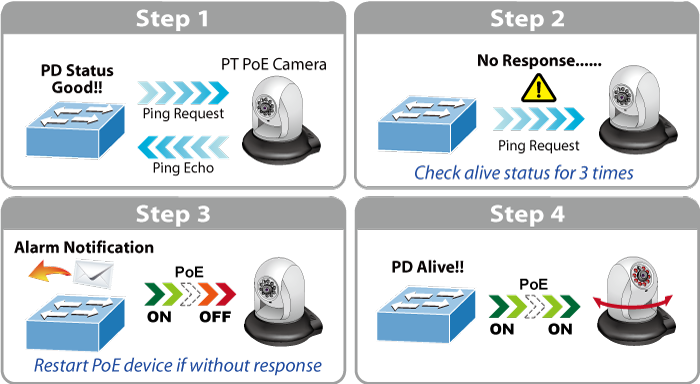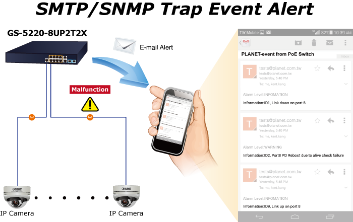 Aunque la mayoría de los software de gestión de cámaras o NVR ofrecen una función de alerta por correo electrónico SMTP, el GS-5220-8UP2T2X proporciona además una función de alerta de evento para ayudar a diagnosticar el dispositivo anormal debido a si hay o no una interrupción de la conexión de red, pérdida de alimentación PoE o la respuesta de reinicio del proceso PD Alive Check.