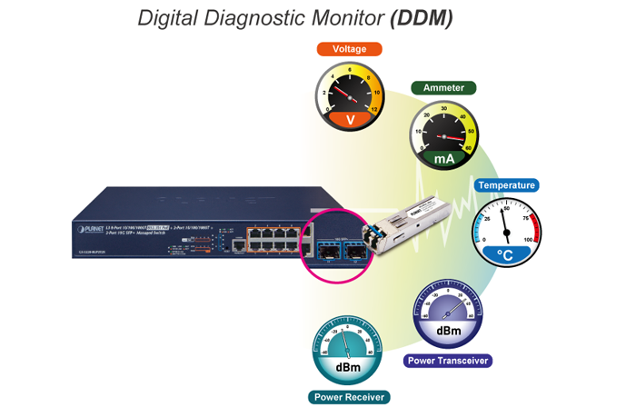El GS-5220-8UP2T2X admite la función SFP-DDM (monitor de diagnóstico digital) que ayuda en gran medida al administrador de red a monitorear fácilmente los parámetros en tiempo real de los transceptores SFP, como la potencia de salida óptica, la potencia de entrada óptica, la temperatura, la corriente de polarización del láser y el voltaje de suministro del transceptor.