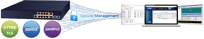 Para una gestión eficiente, el GS-5220-8UP2T2X está equipado con interfaces de gestión de consola, web y SNMP. Con la interfaz de gestión basada en web incorporada, el GS-5220-8UP2T2X ofrece una función de gestión y configuración independiente de la plataforma y fácil de usar. El GS-5220-8UP2T2X admite SNMP y se puede gestionar a través de cualquier software de gestión basado en los protocolos estándar SNMP v1 y v2. Para reducir el tiempo de aprendizaje del producto, el GS-5220-8UP2T2X ofrece comandos similares a los de Cisco a través de Telnet o puerto de consola y el cliente no necesita aprender nuevos comandos desde estos conmutadores. Además, el GS-5220-8UP2T2X ofrece administración remota segura al admitir conexiones SSHv2, TLSv1.2 y SNMPv3 que pueden cifrar el contenido del paquete en cada sesión.