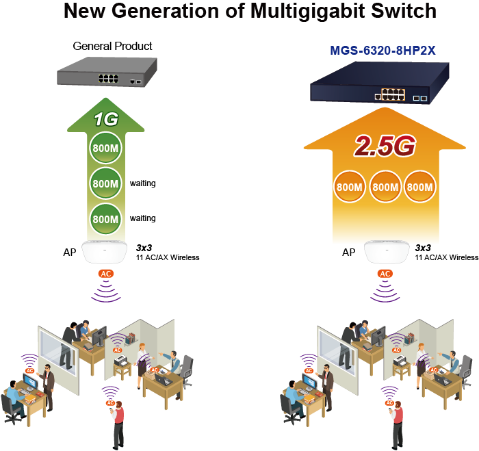 Con velocidades de acceso de terminales de los puntos de acceso inalámbricos 802.11ac que alcanzan de 1,2 Gbps a 2,6 Gbps, los puertos Gigabit no han podido satisfacer la demanda. El MGS-6320-8HP2X, que admite capacidades de 1 Gbps y 2,5 Gbps y salida PoE 802.3af/at y 802.3bt, no solo puede enviar datos a los puntos de acceso inalámbricos 802.11ac, sino también alimentación con los cables Ethernet CAT5e existentes a otros dispositivos alimentados, como puntos de acceso y cámaras IP. Definitivamente puede brindarle la velocidad que necesita y su Plug and Play hace que la instalación sea sencilla