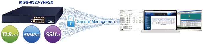 El MGS-6320-8HP2X también proporciona funciones de vigilancia DHCP, protección de origen IP e inspección ARP dinámica para evitar ataques de vigilancia IP y descartar paquetes ARP con direcciones MAC no válidas. El administrador de red ahora puede crear redes corporativas de alta seguridad con considerablemente menos tiempo y esfuerzo que antes.