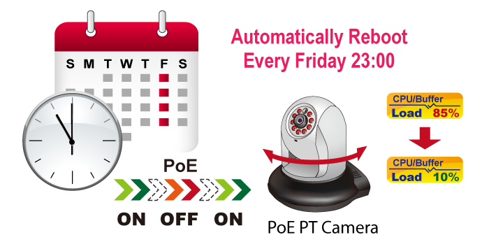 El MGS-6320-8HP2X permite que cada uno de los PD conectados se reinicie a una hora específica cada semana. Por lo tanto, reducirá la posibilidad de que el PD se bloquee debido a un desbordamiento del búfer.