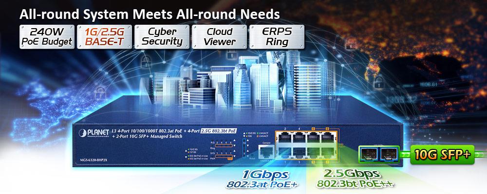 PLANET MGS-6320-8HP2X es un nuevo switch multigigabit administrado de capa 3 que proporciona una velocidad de datos de 2,5 Gbps y PoE++ 802.3bt a través de cables UTP, diseñado para la demanda de equipos de red que requieren un gran ancho de banda, como puntos de acceso inalámbricos Wi-Fi 6 802.11ax, NAS, estaciones de trabajo y aquellos con interfaces 2.5GBASE-T. Cuenta con 4 puertos de cobre 10/100/1000BASE-T con función de inyector PoE+ 802.3at, 4 puertos de cobre 100/1000/2500BASE-T con función de inyector PoE++ 802.3bt, un presupuesto de potencia PoE total de hasta 240 vatios y 2 puertos de fibra SFP+ 1G/2.5G/10GBASE-X adicionales que están diseñados de manera flexible para extender la distancia de conexión. Con una capacidad de enlace de datos tan favorable, un rendimiento de enrutamiento de capa 3 basado en hardware, un motor de conmutación de capa 2 y capa 4 e interfaces de gestión IPv6/IPv4 fáciles de usar pero avanzadas, ayuda a acelerar la implementación de la red inalámbrica y de IoT de próxima generación para empresas y ciudades inteligentes.