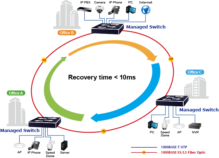 El MGS-6320-2T6S2X admite la tecnología de anillo redundante y presenta una capacidad de autorrecuperación rápida y sólida para evitar interrupciones e intrusiones externas. Incorpora tecnología avanzada ITU-T G.8032 ERPS (Ethernet Ring Protection Switching) y protocolo Spanning Tree (802.1w RSTP) en la red del cliente para mejorar la confiabilidad del sistema y el tiempo de funcionamiento en entornos hostiles. En una determinada red de anillo simple, el tiempo de recuperación podría ser inferior a 10 ms para que la red vuelva rápidamente a funcionar con normalidad.