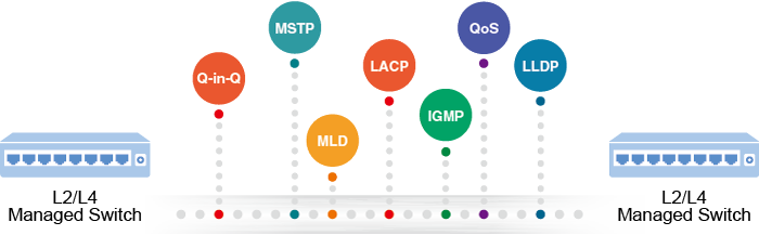 El MGS-6320-2T6S2X se puede programar para funciones avanzadas de administración de conmutadores, como agregación de enlaces de puertos dinámicos, VLAN 802.1Q y VLAN Q-in-Q, protocolo de árbol de expansión múltiple (MSTP), protección de bucle y BPDU, detección de IGMP y detección de MLD. A través de la agregación de enlaces, el MGS-6320-2T6S2X permite el funcionamiento de un enlace troncal de alta velocidad para combinarlo con varios puertos y también admite conmutación por error. Además, el Protocolo de descubrimiento de capa de enlace (LLDP) es el protocolo de capa 2 incluido para ayudar a descubrir información básica sobre los dispositivos vecinos en el dominio de transmisión local.