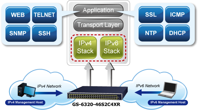 Con compatibilidad con el protocolo IPv6/IPv4 e interfaces de gestión sencillas y fáciles de usar, el GS-6320-46S2C4XR es la mejor opción para que los proveedores de servicios inalámbricos, VoIP y vigilancia IP se conecten con la red IPv6. También ayuda a las PYMES a dar el salto a la era IPv6 con la menor inversión y sin tener que sustituir las instalaciones de red, aunque los ISP establezcan la red de borde FTTx IPv6.