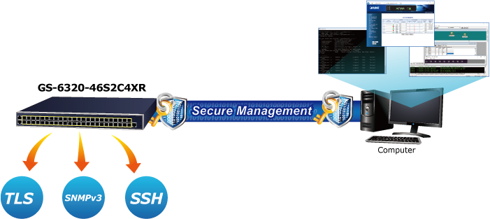 Además, el GS-6320-46S2C4XR ofrece administración remota segura al admitir conexiones SSH, TLS y SNMPv3 que pueden cifrar el contenido del paquete en cada sesión.