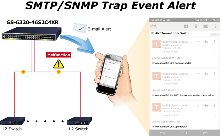 El GS-6320-46S2C4XR proporciona una función de alerta de eventos para ayudar a diagnosticar el dispositivo anormal debido a si hay o no una interrupción de la conexión de red o la respuesta de reinicio.