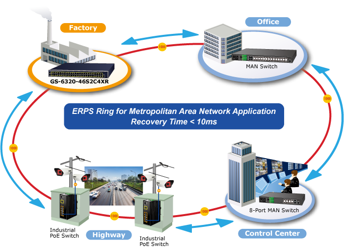 El GS-6320-46S2C4XR admite la tecnología de anillo redundante y cuenta con una capacidad de autorrecuperación rápida y sólida para evitar interrupciones e intrusiones externas. Incorpora tecnología avanzada ITU-T G.8032 ERPS (conmutación de protección de anillo Ethernet), protocolo Spanning Tree (802.1s MSTP) y un sistema de entrada de energía redundante en la red de automatización del cliente para mejorar la fiabilidad del sistema y el tiempo de funcionamiento en entornos industriales hostiles. En una determinada red de anillo simple, el tiempo de recuperación podría ser inferior a 10 ms para que la red vuelva rápidamente a funcionar con normalidad.