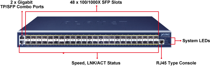 El conmutador administrado de capa 3 GS-6320-46S2C4XR de PLANET cuenta con 48 puertos SFP de 100/1000 Mbps, 2 puertos de cobre RJ45 compartidos, 4 puertos SFP+ de 10 G y enrutamiento IP de capa 3 en una carcasa de metal de 19 pulgadas que proporciona un rendimiento de alta densidad. Con un enlace ascendente de 10 Gbps y una estructura de conmutación de 176 Gbps, el GS-6320-46S2C4XR simplifica enormemente las tareas de manejo de cantidades extremadamente grandes de datos en una topología segura que se vincula a la red troncal o a servidores de alta capacidad para ISP y VoIP empresarial, transmisión de video y aplicaciones de multidifusión.