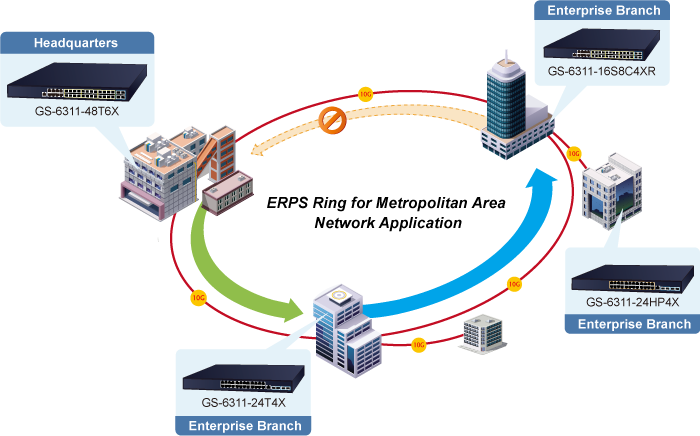 El GS-6311-16S8C4XR admite la tecnología de anillo redundante y presenta una capacidad de autorrecuperación rápida y sólida para evitar interrupciones e intrusiones externas. Incorpora tecnología avanzada ITU-T G.8032 ERPS (Ethernet Ring Protection Switching) y protocolo Spanning Tree (802.1s MSTP) en la red del cliente para mejorar la confiabilidad del sistema y el tiempo de funcionamiento en entornos hostiles. En una determinada red de anillo simple, el tiempo de recuperación podría ser inferior a 15 ms para que la red vuelva rápidamente a funcionar con normalidad.