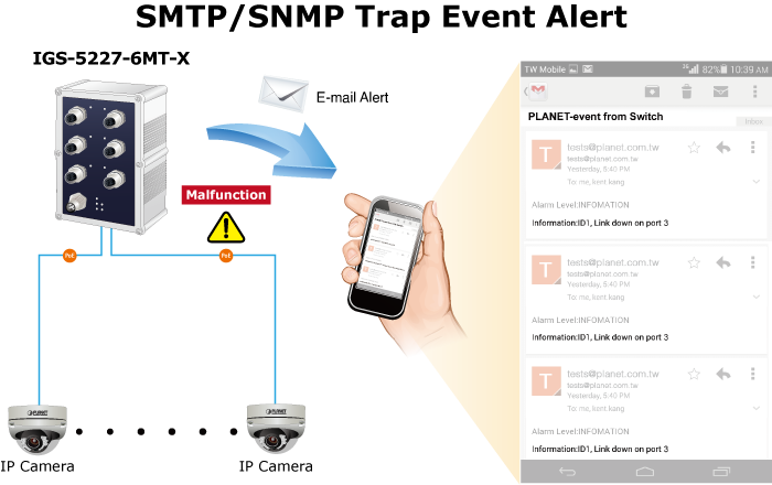 Aunque la mayoría del software de gestión de cámaras o NVR ofrece una función de alerta por correo electrónico SMTP, el IGS-5227-6MT-X también ofrece una función de alerta de evento para ayudar a diagnosticar el dispositivo anormal debido a si hay o no una interrupción en la conexión de red.