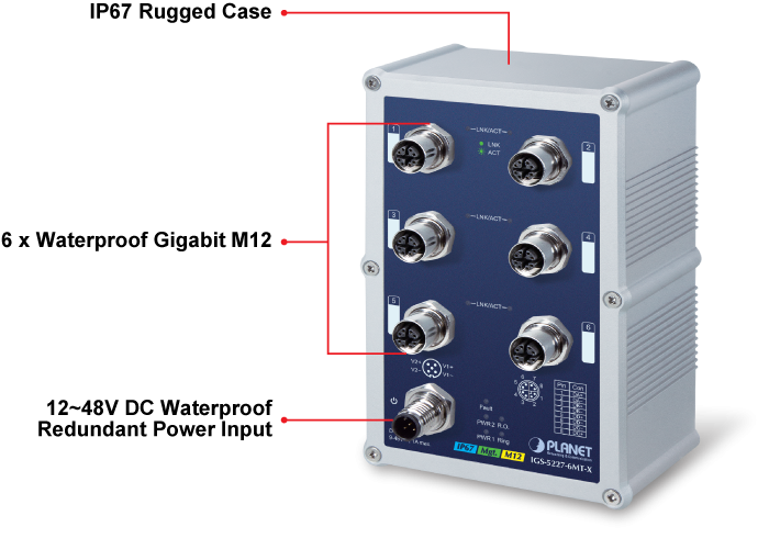 PLANET IGS-5227-6MT-X, un conmutador Ethernet gestionable de capa 2+ industrial, viene con una carcasa industrial con clasificación IP67, 6 puertos 10/100/1000T y enrutamiento estático de capa 3, lo que proporciona un alto nivel de inmunidad contra interferencias electromagnéticas y sobretensiones eléctricas intensas que suelen encontrarse en los pisos de las plantas o en los gabinetes de control de tráfico en las aceras. El IGS-5227-6MT-X se puede montar fácilmente en un riel DIN o en la pared, ocupando menos espacio.