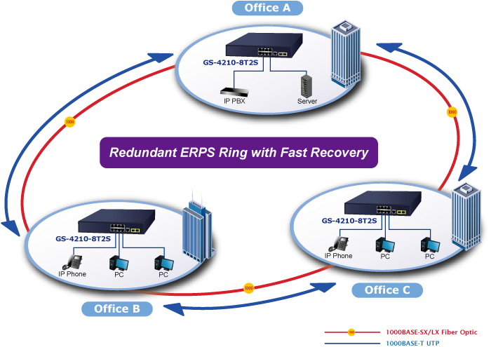 El GS-4210-8T2S admite la tecnología de anillo redundante y cuenta con una capacidad de autorrecuperación rápida y sólida para evitar interrupciones e intrusiones externas. Incorpora tecnología avanzada ITU-T G.8032 ERPS (Ethernet Ring Protection Switching) y protocolo Spanning Tree (802.1s MSTP) en la red del cliente para mejorar la confiabilidad y el tiempo de actividad del sistema en varios entornos.
