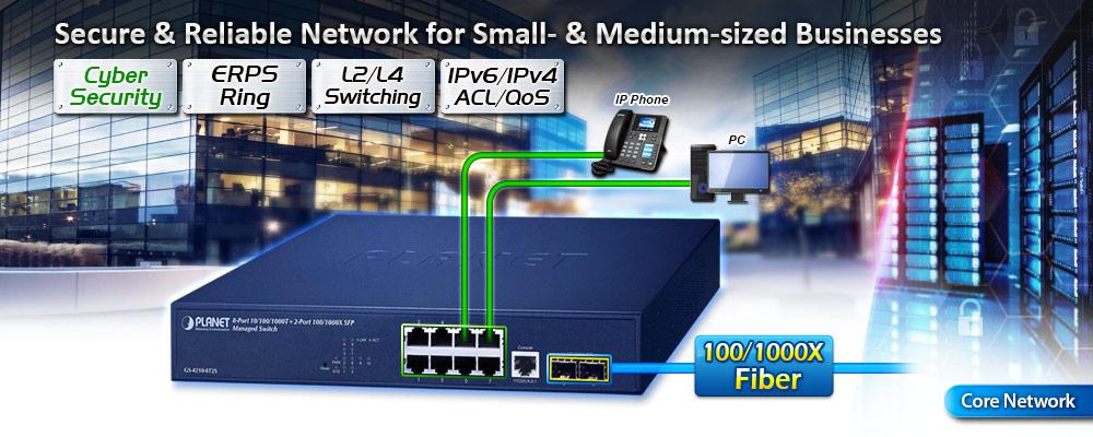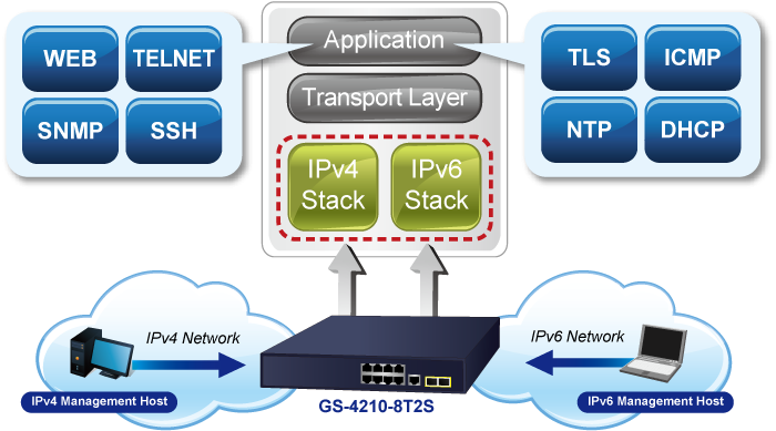 Al ser compatible con los protocolos IPv6 e IPv4, el GS-4210-8T2S ayuda a las PYMES a dar el salto a la era IPv6 con la menor inversión, ya que no es necesario reemplazar ni revisar sus instalaciones de red si se configura la red de borde FTTx IPv6.