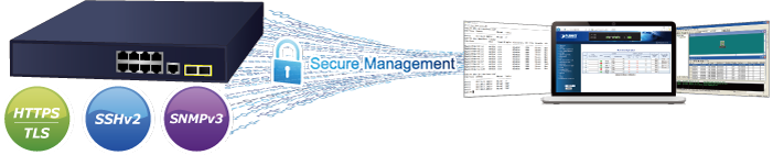 Además, el GS-4210-8T2S ofrece una administración remota segura al ser compatible con conexiones SSHv2, TLSv1.2 y SNMP v3 que cifran el contenido de los paquetes en cada sesión.