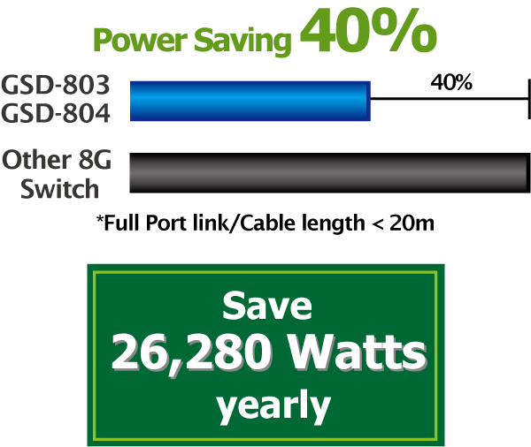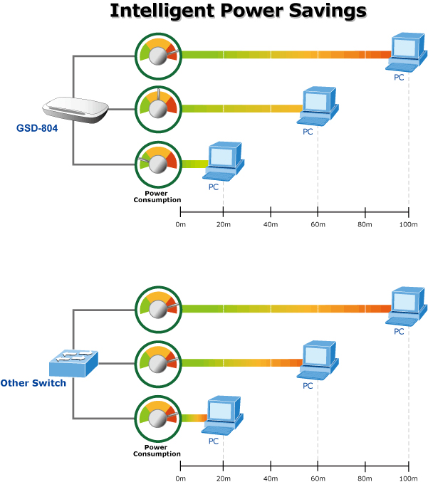 Las escalas de energía inteligentes, la otra tecnología adoptada, es un algoritmo inteligente que determina activamente el nivel de energía adecuado en función de la longitud del cable. Cuando el GSD-804 se conecta con un cable Ethernet de menos de 20 m, un dispositivo puede obtener el máximo ahorro de energía porque el GSD-804 detectará automáticamente la longitud del cable Ethernet y disminuirá el uso de energía. El dispositivo conectado puede reducir sustancialmente el consumo total de energía, lo que contribuye significativamente al ahorro de energía.